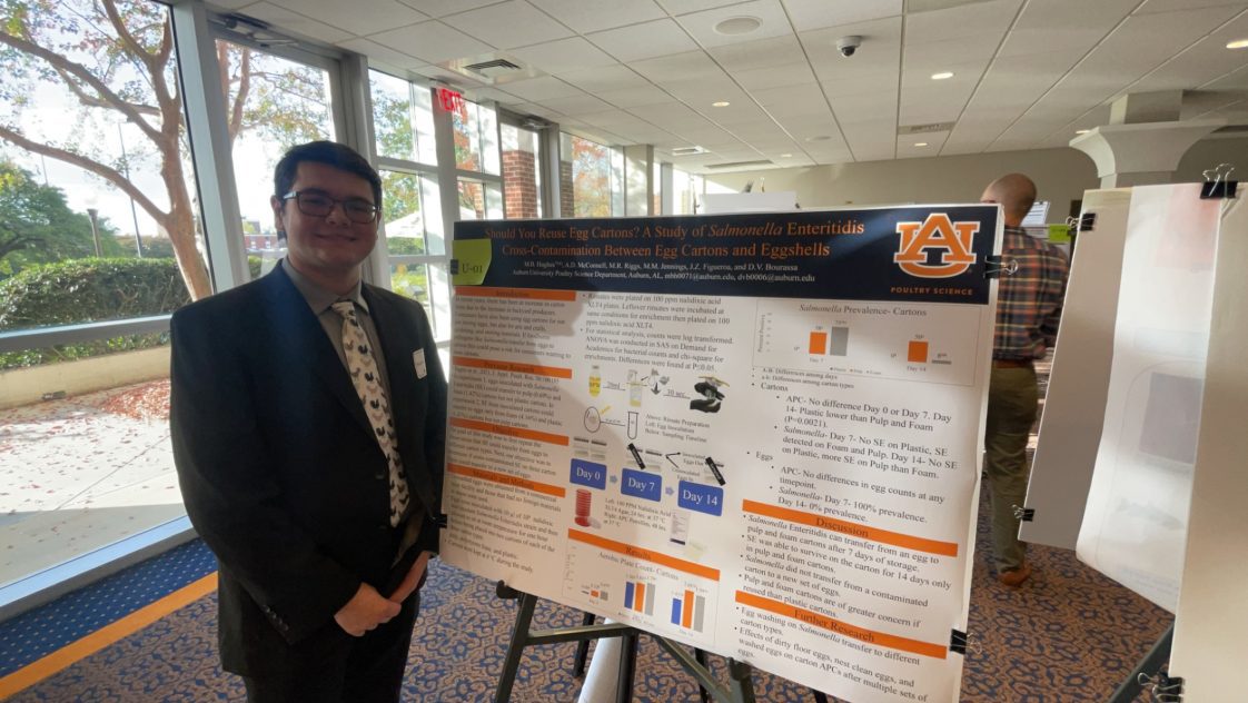 Auburn is one of only six universities in the U.S. with a dedicated poultry science department. This proved to be the right choice for Hughes, as he excelled academically and conducted lab research under Dianna Bourassa, a poultry specialist with the Alabama Cooperative Extension System. The research lab run by Bourassa, also an associate professor in the College of Agriculture, focuses on foodborne pathogen control, egg quality and animal welfare. Hughes’ work earned him recognition and awards at conferences across the country.