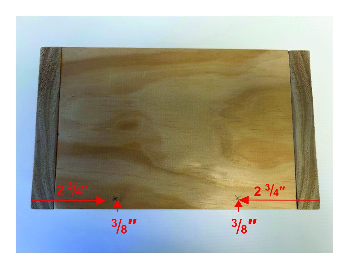 7. Examine the box and decide which open end will be the bottom. Measure along the bottom edges (ends and sides) and use a pencil to mark your nail locations (two along both ends and two along both sides). The position of the nails needs to be 3/8″ up from the bottom of the box, 1½″ from the edge of the end piece, and 2¾″ from the edge along the sides.