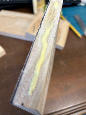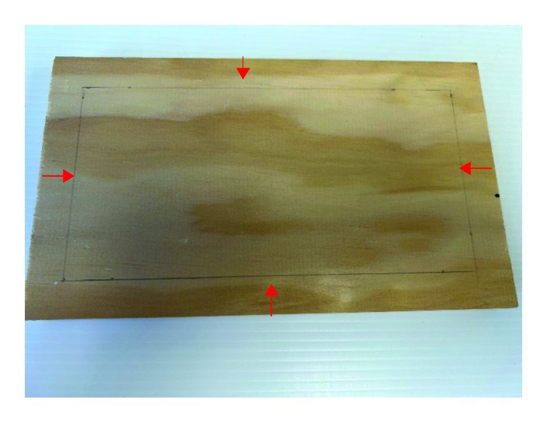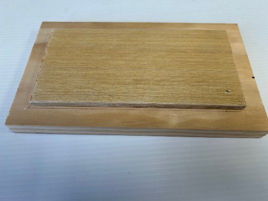 12. The piece of plywood should fit exactly inside the rectangle you just drew. Check it for positioning. Apply glue to one of the flat sides of the plywood and then position it inside the rectangle you drew on the top piece. Let it set for a couple of minutes, and then flip the lid over and insert the plywood inside the top of the box. Make sure the top fits flush along all four sides. If it doesn’t, you should still be able to move the piece of plywood to make it fit correctly. Once you are satisfied with the fit, carefully lift the top off and place it back on the work area with the plywood side up (Don’t let the plywood move, but if it does, reposition it.) Place a flat, heavy object on top of the plywood to help provide downward pressure. Let it dry for at least an hour.
