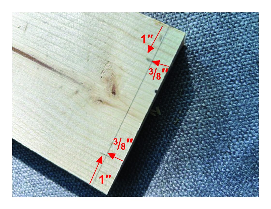 3. Take one end piece (1″ × 6″ × 5½″) and measure using a ruler, 1 inch from each side and 3/8″ from the ends and make two pencil marks. Repeat this on the other end piece. The pencil marks indicate where you will place the 1½″ finish nails during assembly.