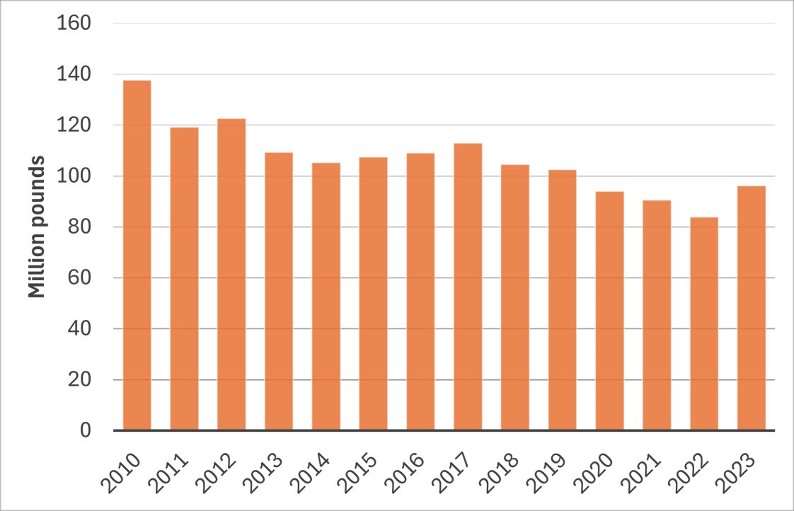 Figure 1. Food-size catfish sales in Alabama, 2010–2023 (Source: USDA NASS).
