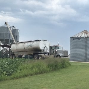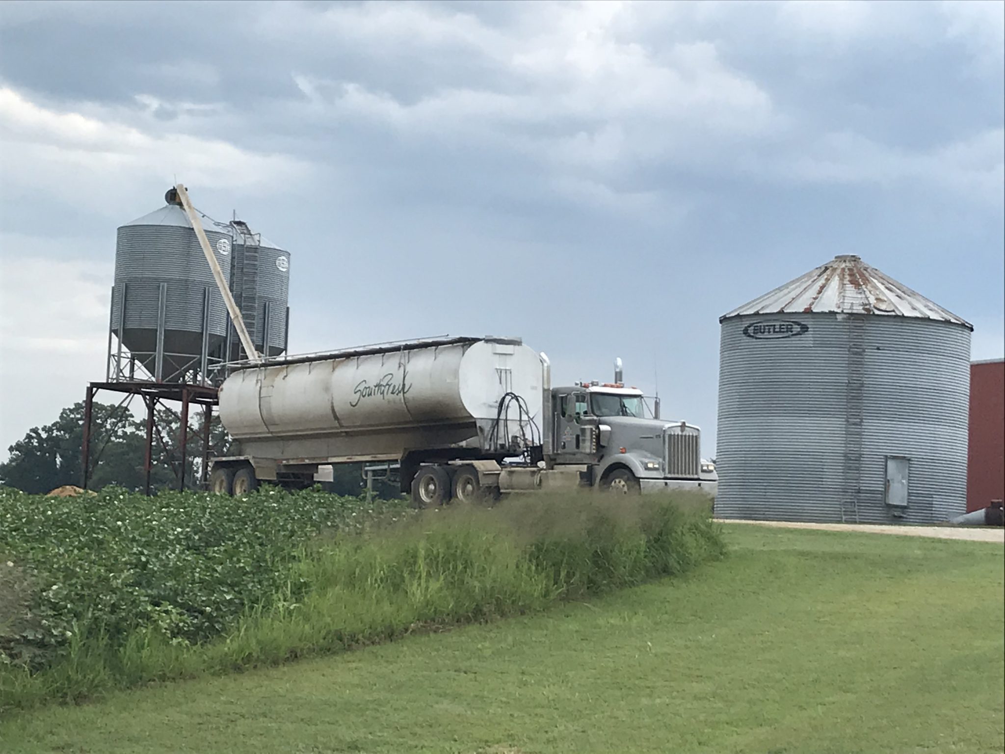 Figure 6. Once the antibiotic feed is received on the farm, catfish are fed using a feed truck equipped with a blower for a specific number of days depending on the antibiotic prescribed.