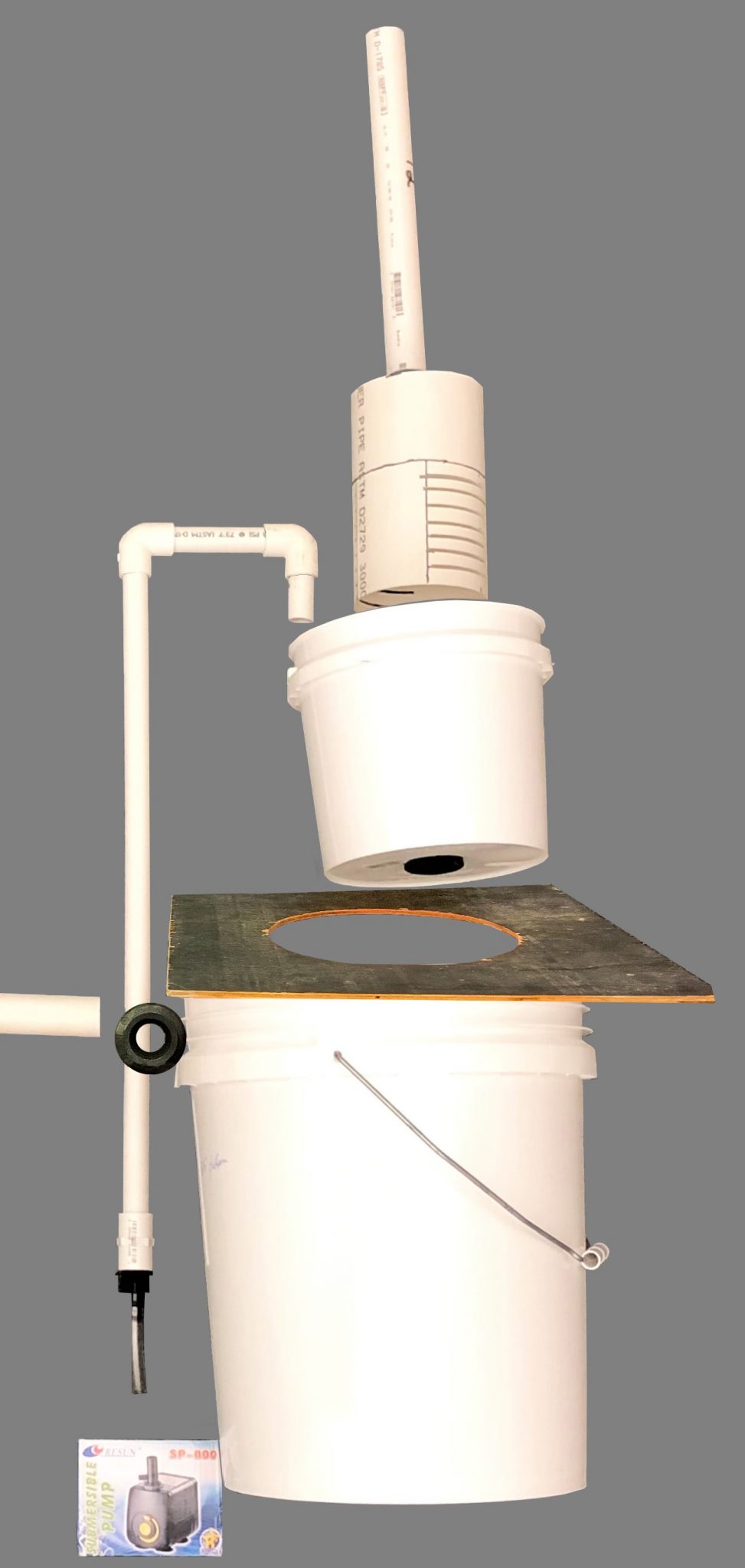 - Arrange the components of the system so that your pump supplies water to the 1-gallon filter bucket, outside of the 4-inch pipe (photo 4). This ensures that the water must pass through the filter material before entering the standpipe to the 5-gallon bucket. Once the water fills the 5-gallon bucket, it will overflow via gravity drain into the grow tray. Place the 5-gallon bucket overflow pipe so that is outside of the 4-inch pipe in the grow tray. The grow tray fills with water and begins to overflow back into the aquarium. Once the air is pulled out of the dome of the 2-inch cap, it will start the siphon and quickly drain the plant grow bed. When the water level reaches the open end of the 3/8-inch hose on the side of the bell siphon, air will flow back into the top of the dome and break the siphon and the process begins anew.