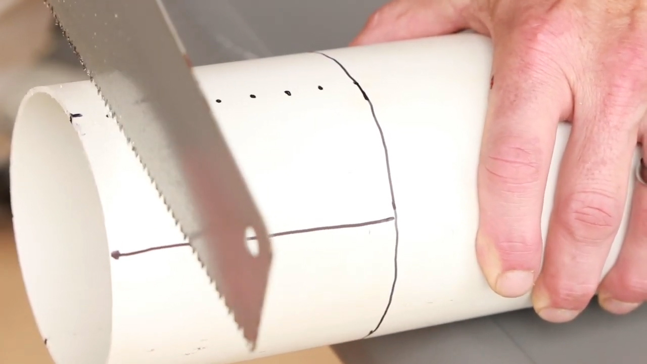- Cut a 5-inch long piece of 2-inch PVC pipe and smooth the rough edges on both ends. Draw a line 1⁄2 inch from one end of the pipe, then drill a line of 1⁄4-inch holes below the line around the edge of the pipe and smooth the rough edges. Place the holes close together so there will be about 20 holes.