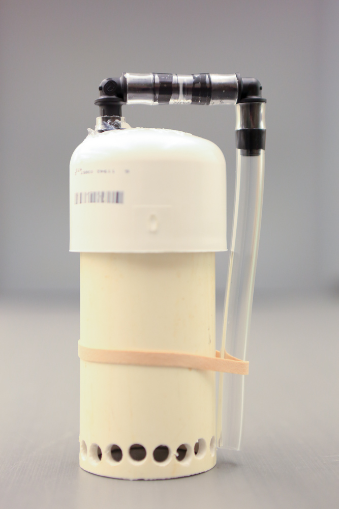 - Halfway between the center and one edge of the 2-inch cap, drill a 1/2-inch hole and insert the 1-inch piece of 3/8-inch clear tubing. Push the 90-degree 3/8-inch barb into the tubing to seal the edges around the hole. Place the 2-inch PVC cap on the opposite end from the holes. You can test the seal by putting your finger over the outlet of the barb connector and placing it in water with air under the cap. If you find that air can escape around the hole, you may need to seal with silicone. Attach the 1 1/2-inch piece of clear tubing to the 90-degree barb. Orient the barb so that it points across the 2-inch cap and place the second 90-degree barb so that it points downward along the side of the cap. Attached the 6 inch piece of clear tubing to the downward facing barb and lay the tubing along the length of the 2-inch PVC pipe. The opening of the tube should be close to the holes in the bottom end of the 2-inch pipe. Use the rubber band to hold the tubing in place. Do not constrict the tubing with the rubber band. This tubing will break the siphon during the draining process. Its placement will control how low the water drains in the plant tray. To see additional details on building the siphon, see this short video at https://youtu.be/5jWv4ajDH_w. Note: the length of the standpipe is 1-inch longer in the video.