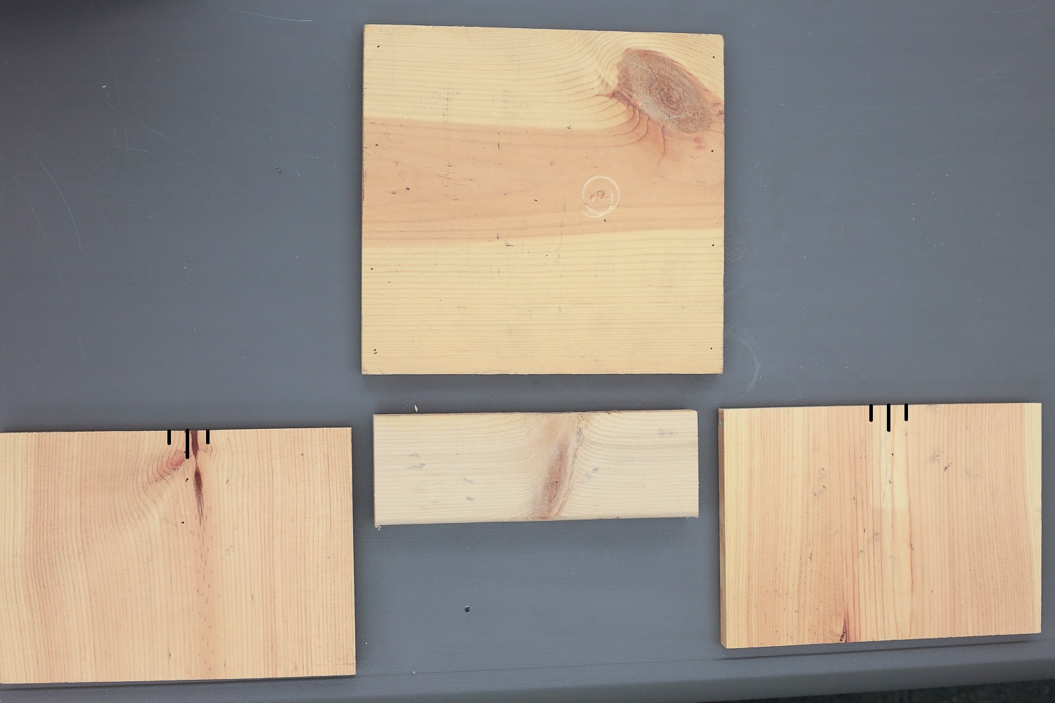 - Place a mark at 4 inches along one cut side of each of the two 8-inch-long side boards and then draw another mark 3⁄4 of an inch on either side of this center mark. This will help align where to place the 2×4 board in the middle of the sides.