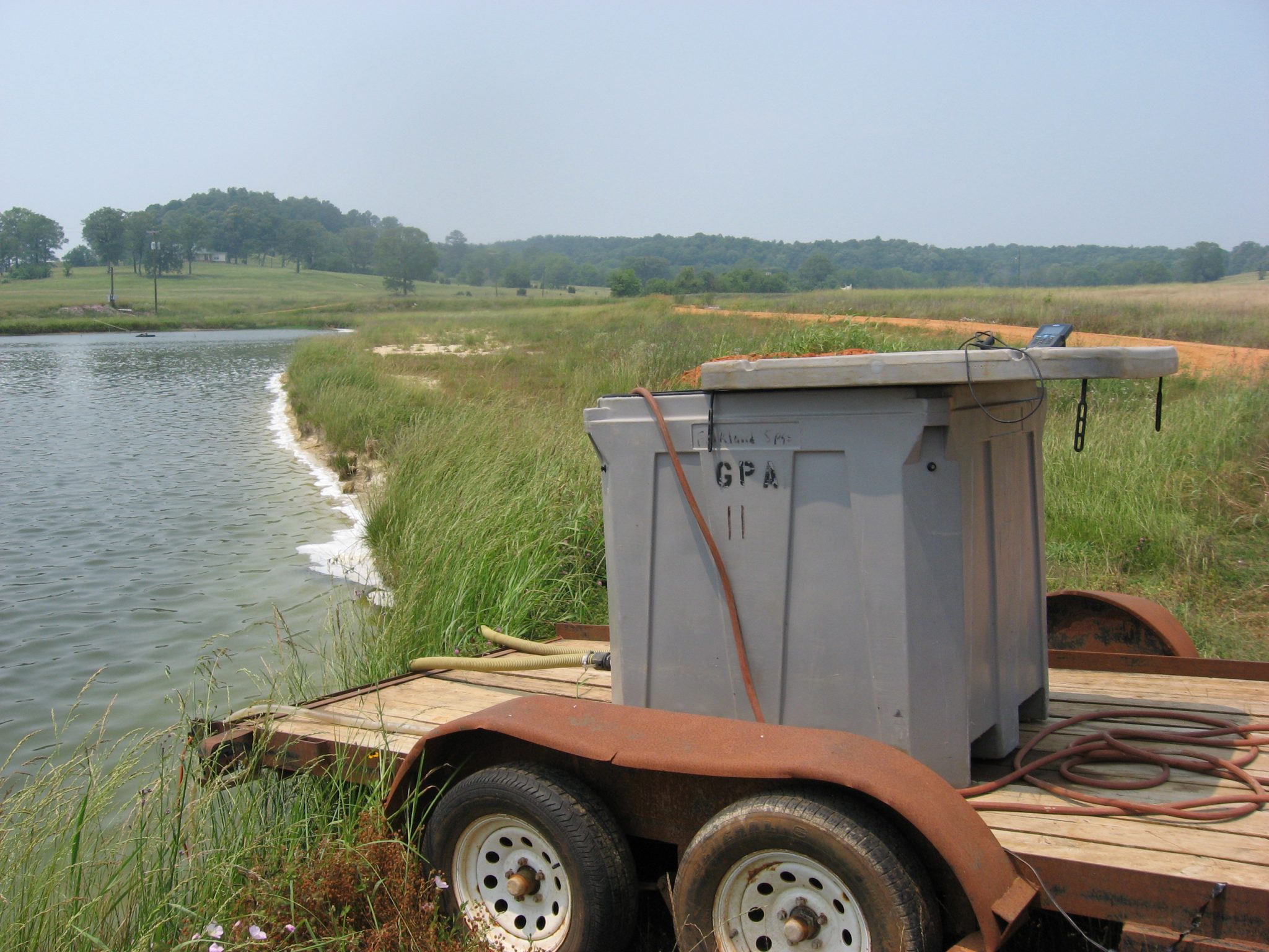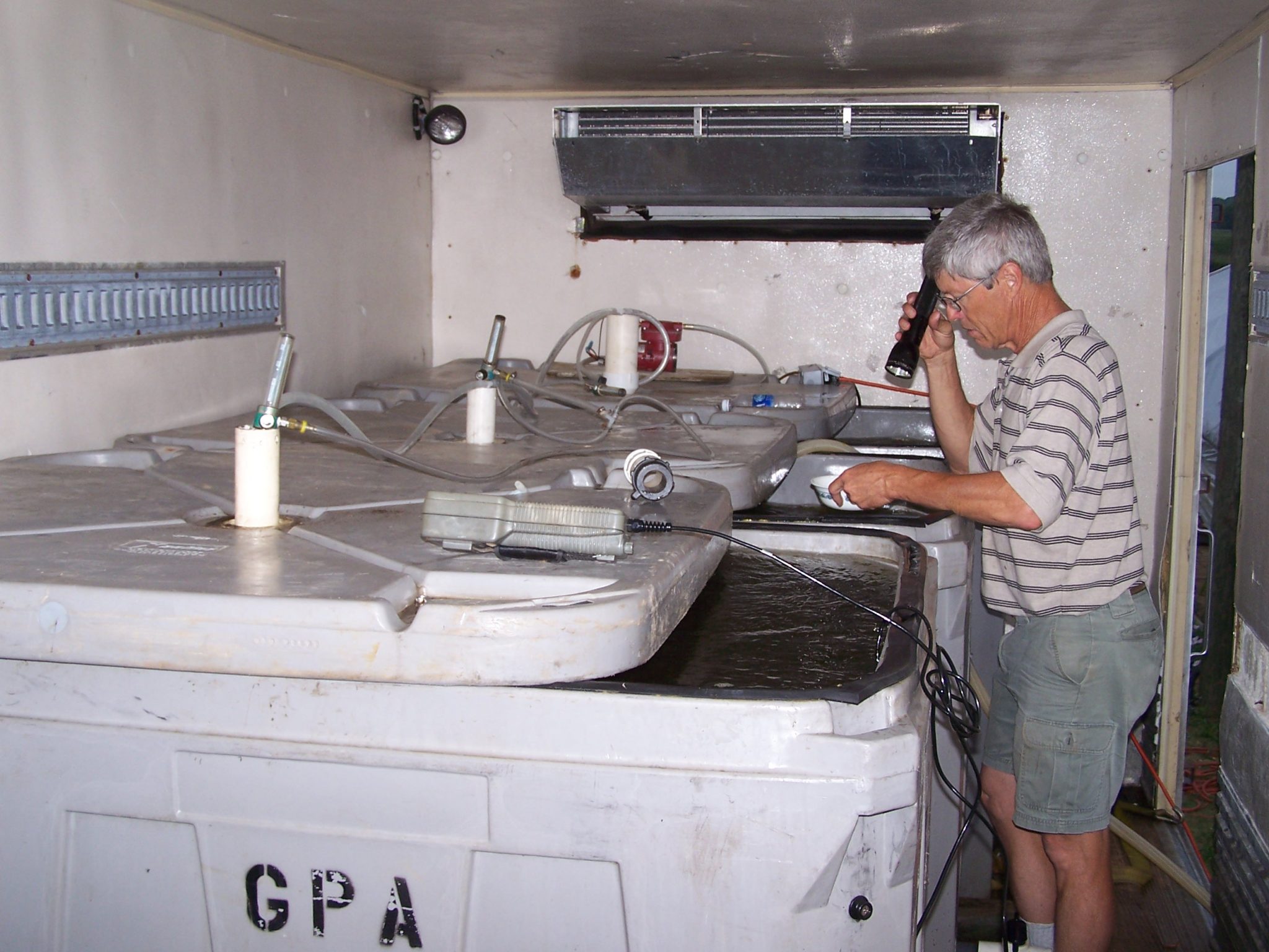 Producers purchase shrimp postlarvae (baby shrimp) from commercial hatcheries in Florida or Texas and transport them to Alabama in live hauling tanks (figure 2) with water salinity of 30 ppt. Upon arrival at the farm, producers begin the process of acclimating shrimp from the high salinity in which they arrive to the lower salinity (typically 2 to 6 ppt) of production ponds on the farm (figure 3).