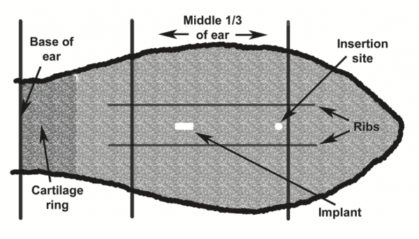 - Select the proper implant site on the back of the ear (figure 1). Place the implant between the skin and cartilage in the middle third of the ear.