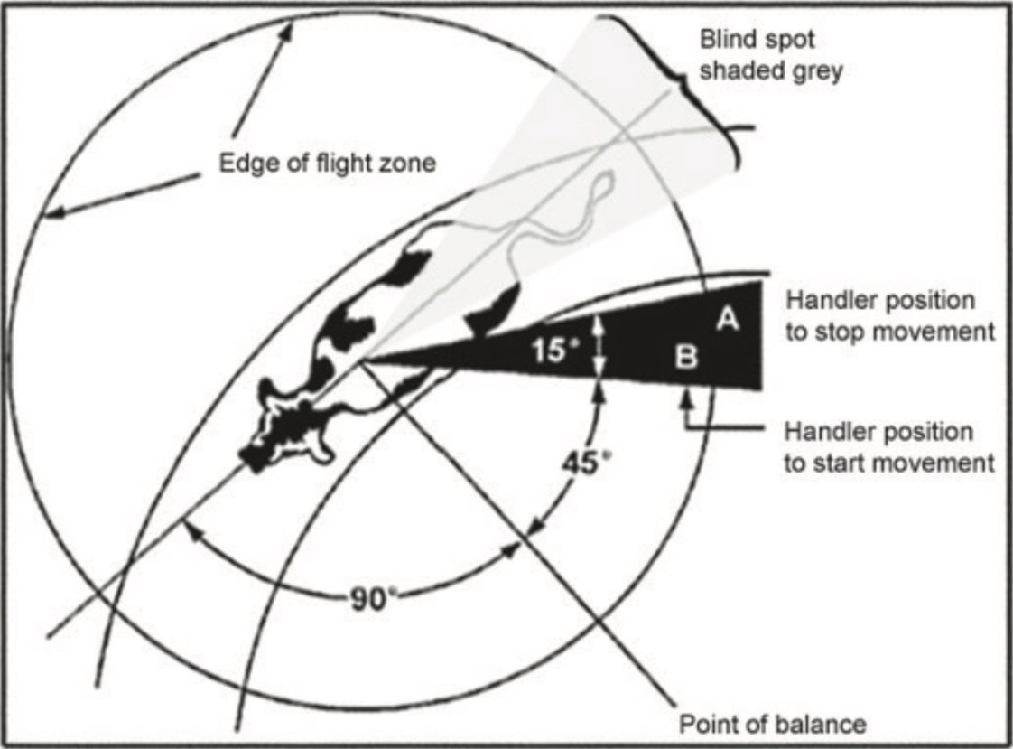 Understand the flight zone and point of balance. The direction an animal moves depends on where a handler enters the flight zone (figure 1). Cattle will move forward when approached behind the shoulder and backward when approached in front of the shoulder. A handler entering the blind spot will cause the cattle to stop, turn, and look at that person. They want to know where the person is at all times. Avoid the cow’s blind spot; a handler may be kicked when in close quarters.