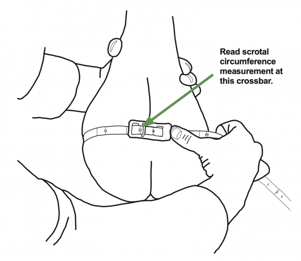 - Take the circumference reading (in centimeters) at the index formed by the small stainless steel crossbar on the scrotal circumference tape thumb piece. For example, the bull in figure 1 has a scrotal circumference that is slightly greater than 37 centimeters.
