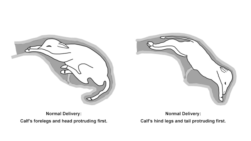 The first step in providing assistance during calving is assessing the problem. There are several common situations encountered when delivering a calf. In a normal delivery, the calf’s forelegs and head protrude first about 70 percent of the time. The other 30 percent of the time, the calf’s hind legs and tail come first. In this case, always make sure the tail is protruding with the hind legs.