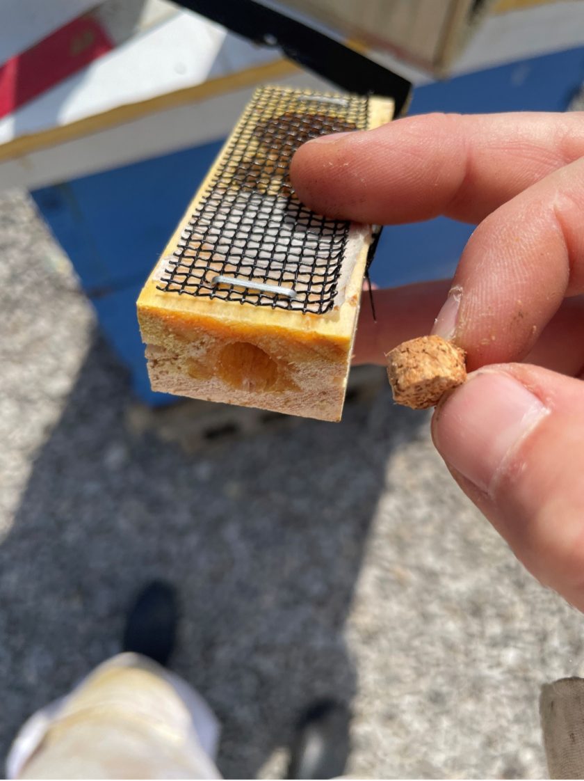- Figure 3. Remove the cork from candy end of the queen cage. (Photo Credit: Allyson Shabel)