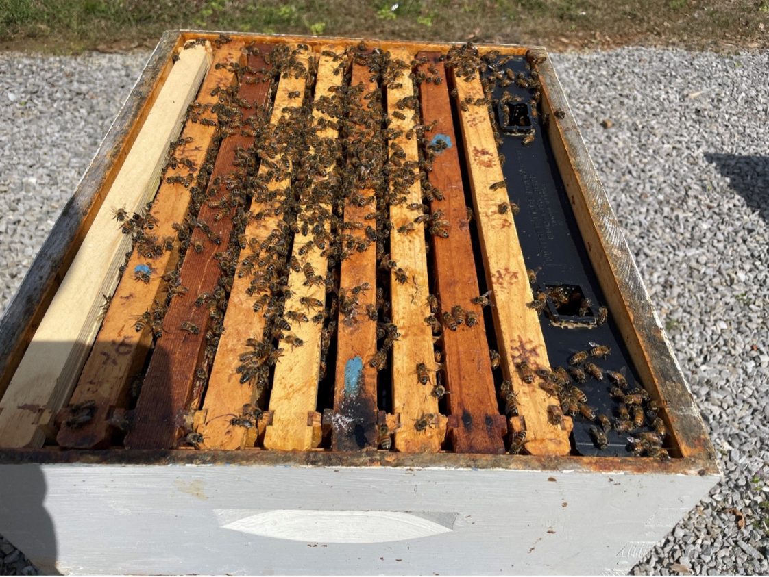 - Figure 5. Package box and queen cage removed, additional frames and feeder in place. (Photo Credit: Allyson Shabel)