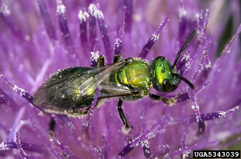 - Figure 13. Sweat bees are small, colorful bees thought to sting people working outdoors. They are not aggressive but will sting in defense. (Photo credit: Dave Cappaert, Bugwood.org)