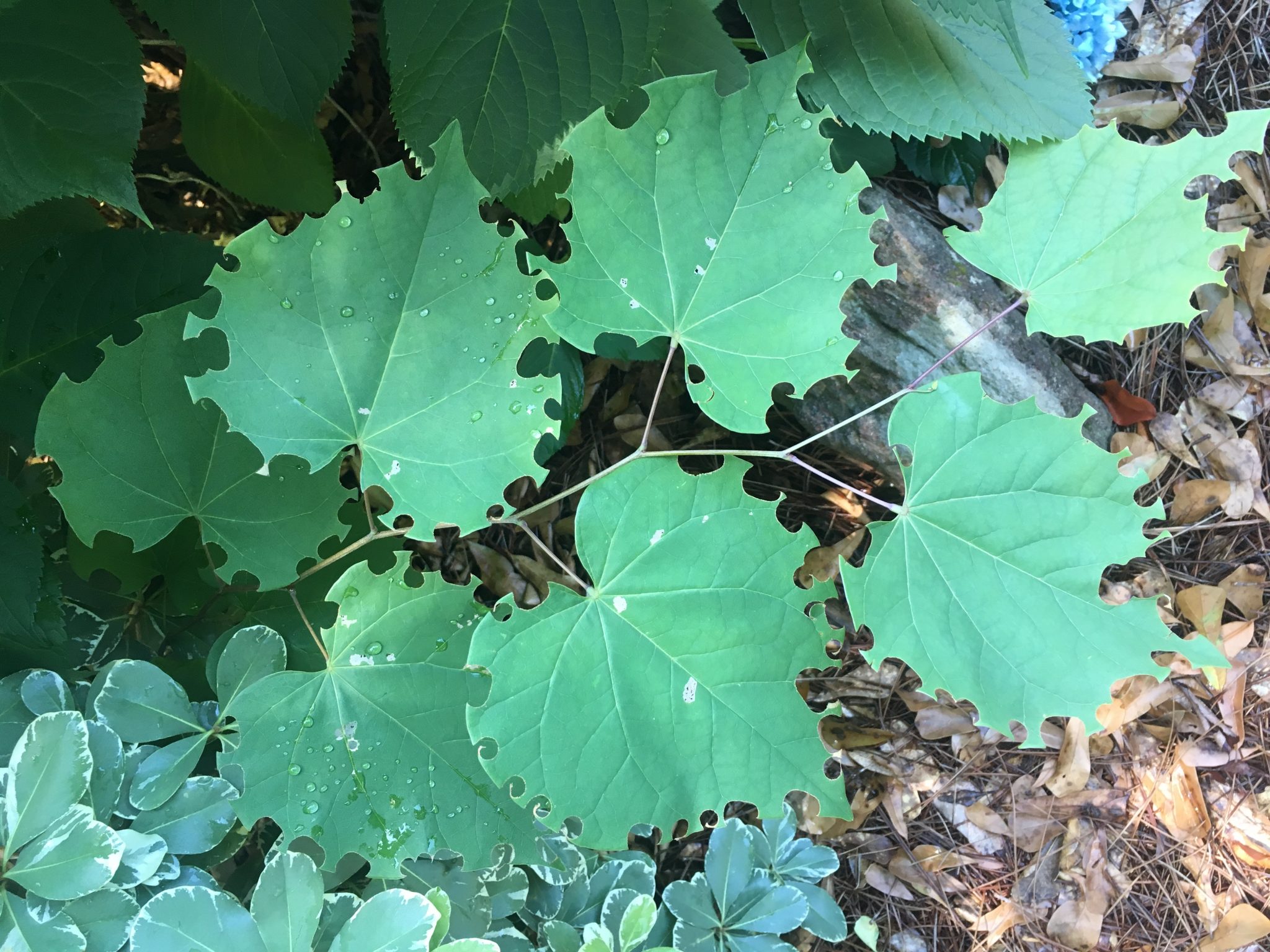 Leaf cutter bees cut small circular areas around the edge of leaves. They are particularly fond of native redbud trees. They make almost perfect circular holes along the edge of the tree’s heart-shaped leaves (fig. 12), usually in late spring or early summer. The amount of leaf material removed is small, and the tree will never be defoliated by leaf cutter bees.