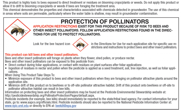 Bee box: Pesticide labels contain a section specifically listing potential hazards to pollinators. This is referred to as the “bee box.”