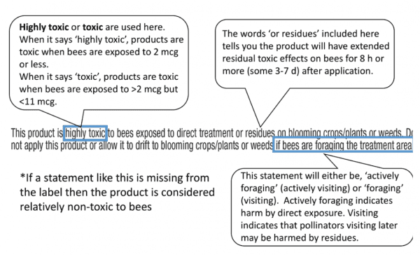 Toxicity: Statements on labels like these contain terms that indicate the relative toxicity of the product, how long a treatment may affect pollinators, and the conditions under which the product should not be applied.