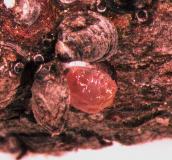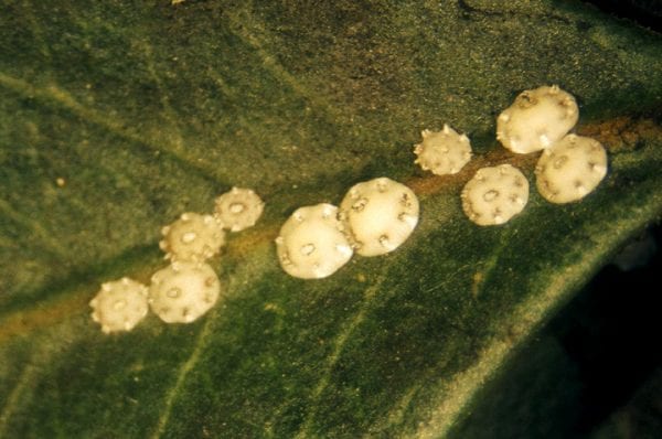 Assessing whether or not a scale insect is alive can be tricky, because the dead often look the same as the living. The best way to find out is to use a small sewing needle and a hand lens to flip over the waxy coating. Living armored scale insects will look full and rounded under the waxy coating (fig. 10), and others will just squash when you try to uncover them.