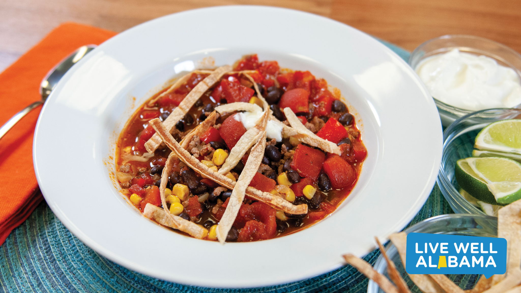 Our Potluck Taco Soup is made with canned veggies and beans. Make sure to drain and rinse canned ingredients before using to reduce salt. Serves 8.