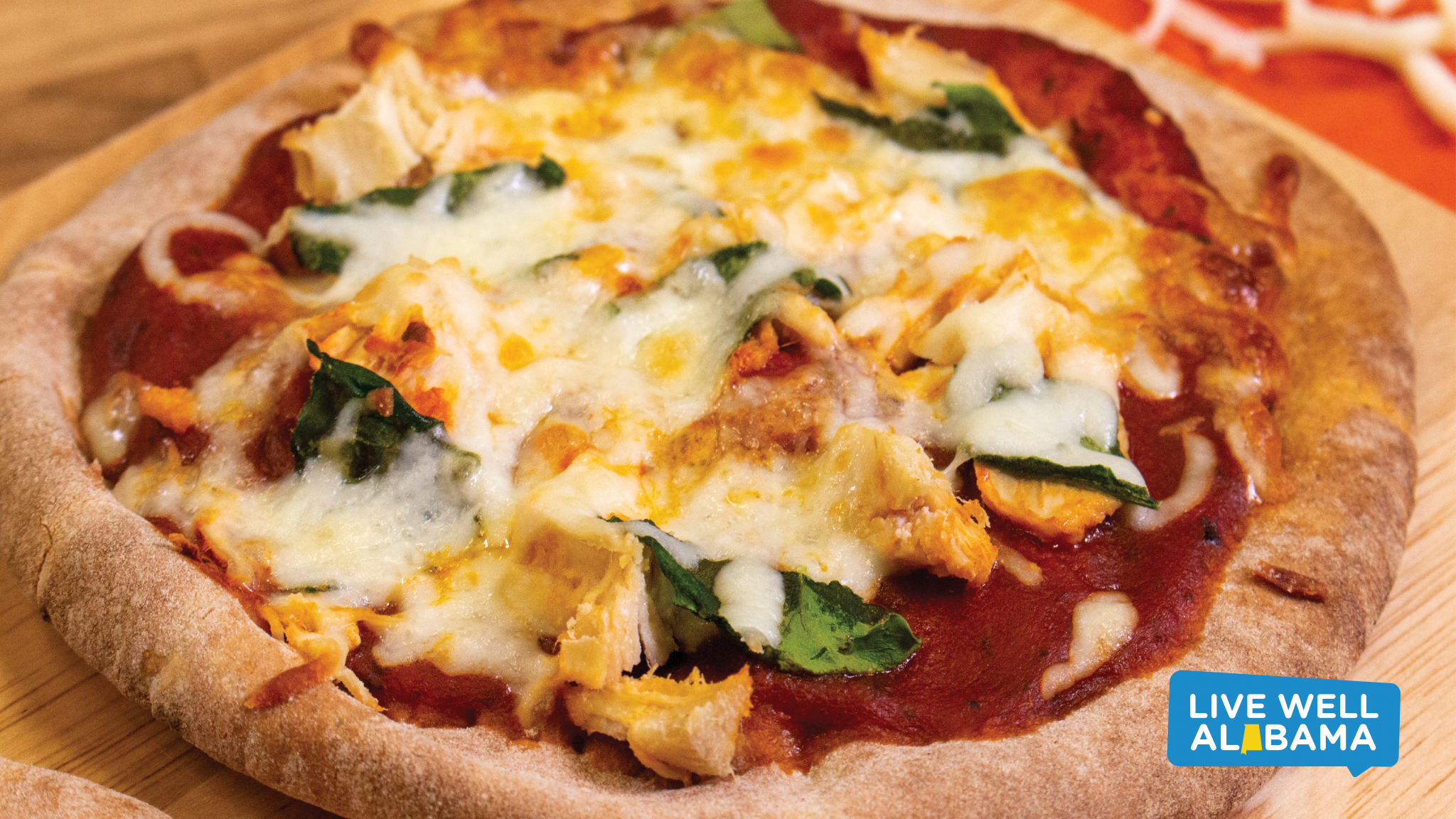 Place pizza sauce, chicken, spinach, and cheese evenly on pita.