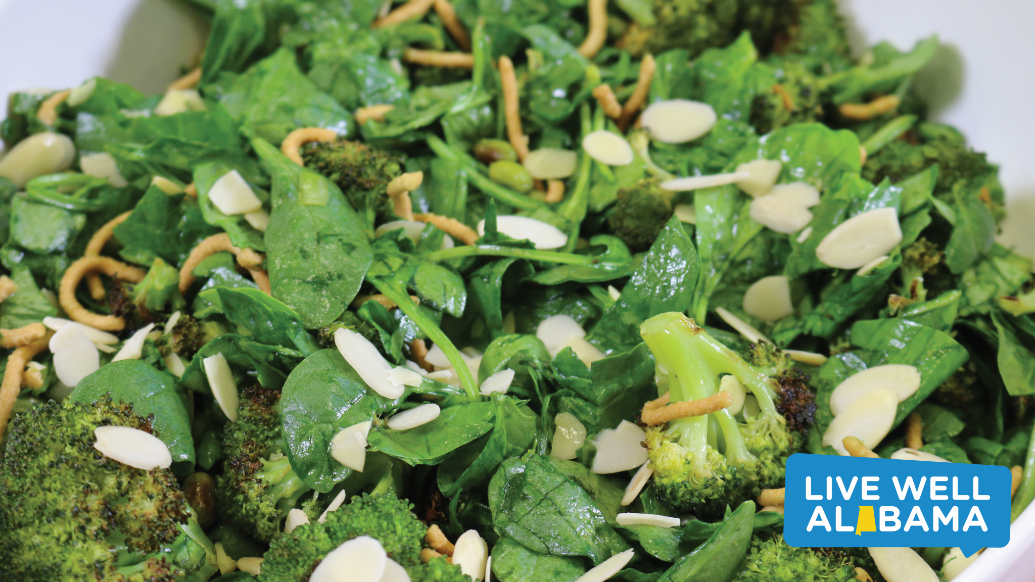 Try our Roasted Broccoli Salad with Almonds! Dark green veggies like spinach and broccoli are packed with nutrients and low in calories. Serves 10.