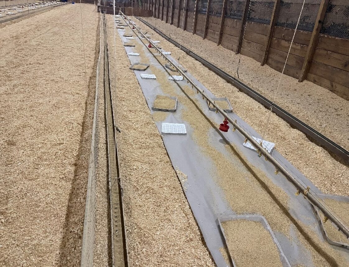 A half-house area should provide a minimum of 0.75 square feet per bird, both males and females. Birds are typically turned out to a full house on day 21 at 1.5 to 1.6 square feet per bird for females and 2.8 to 3 square feet per bird for males. Chicks reared with a quarter-house brood are held until 7 days and then turned out to a half-house until 21 days. To accommodate quarter-house brood setup, a temporary fence can be placed from the side wall to the other side of the nipple waterers so that chicks have easy access to feed and water (figure 1).