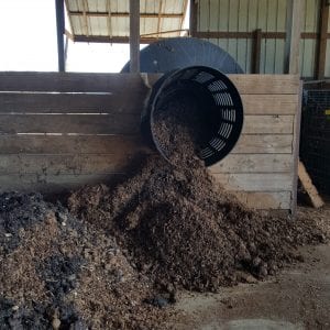 Composted animal mortality is to be spread on the farm of origin and requires a permit from the state veterinarian in order to be moved off that farm. The composting bins are typically included in the dry-stack storage barn for ease of loading and cleaning out on the impervious surface.