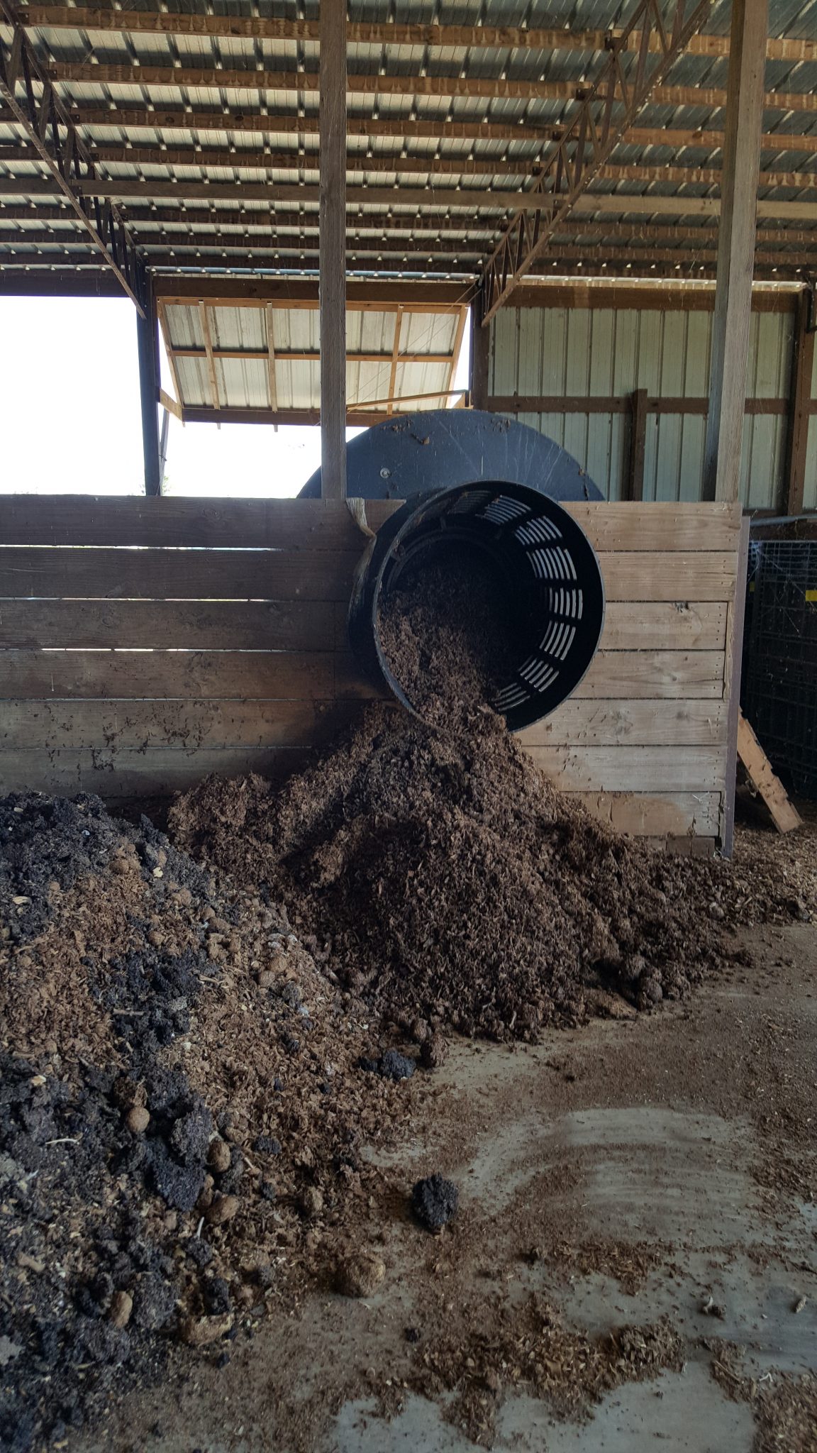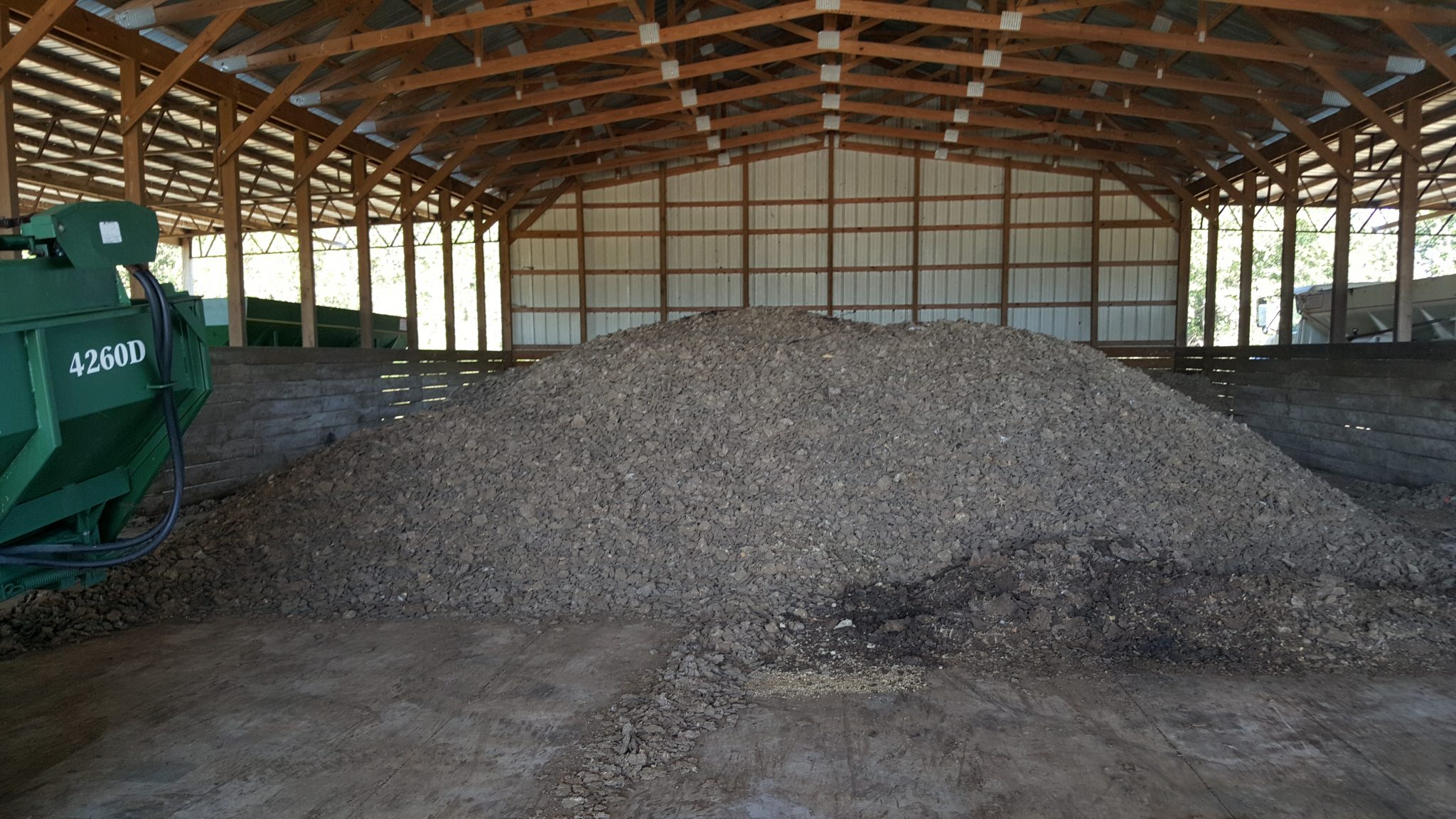 Composted animal mortality is to be spread on the farm of origin and requires a permit from the state veterinarian in order to be moved off that farm. The composting bins are typically included in the dry-stack storage barn for ease of loading and cleaning out on the impervious surface.