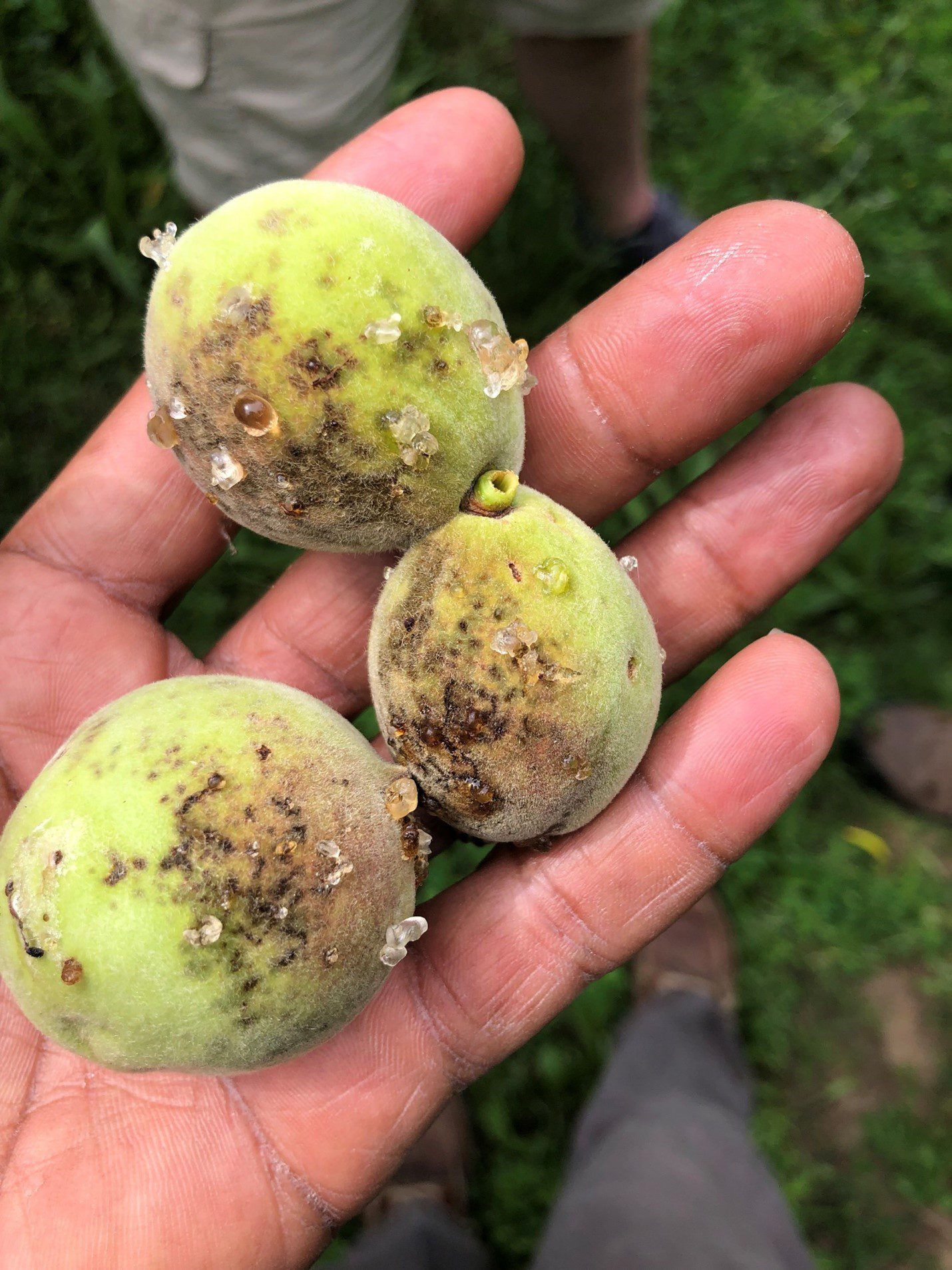 Management of this disease often requires pesticide applications effective against bacterial pathogens from the late dormant period through shuck split. Some varieties are more susceptible than others, but in the southeast, all varieties could benefit from spray applications.