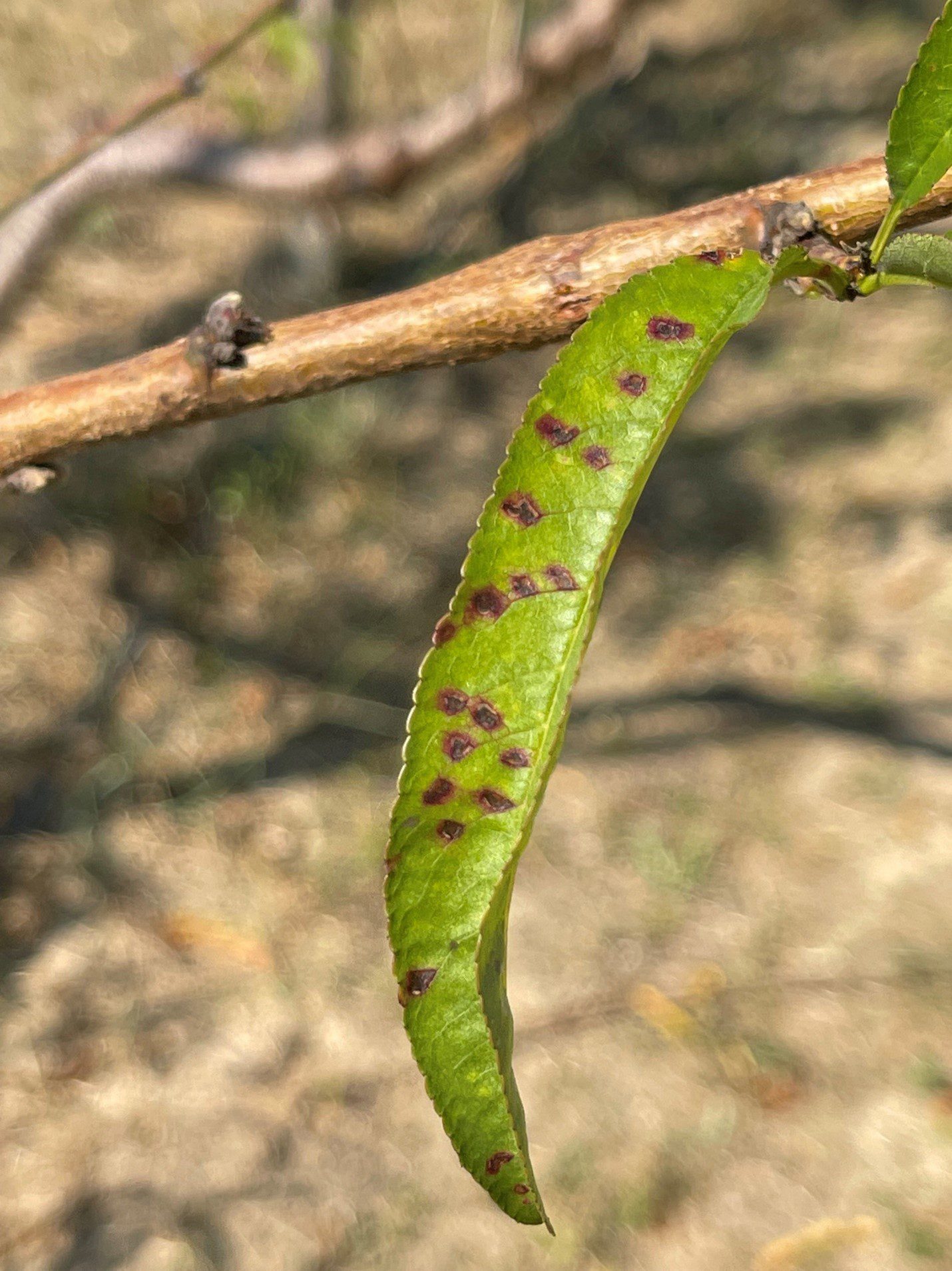 - Bacterial spot is more severe in trees grown in sandy soils and stressed trees. Trees planted in sandy areas, such as near dirt roads, can be especially susceptible as wind-blown grains of sand can cause wounds on leaves, which can be entry points for the pathogen.