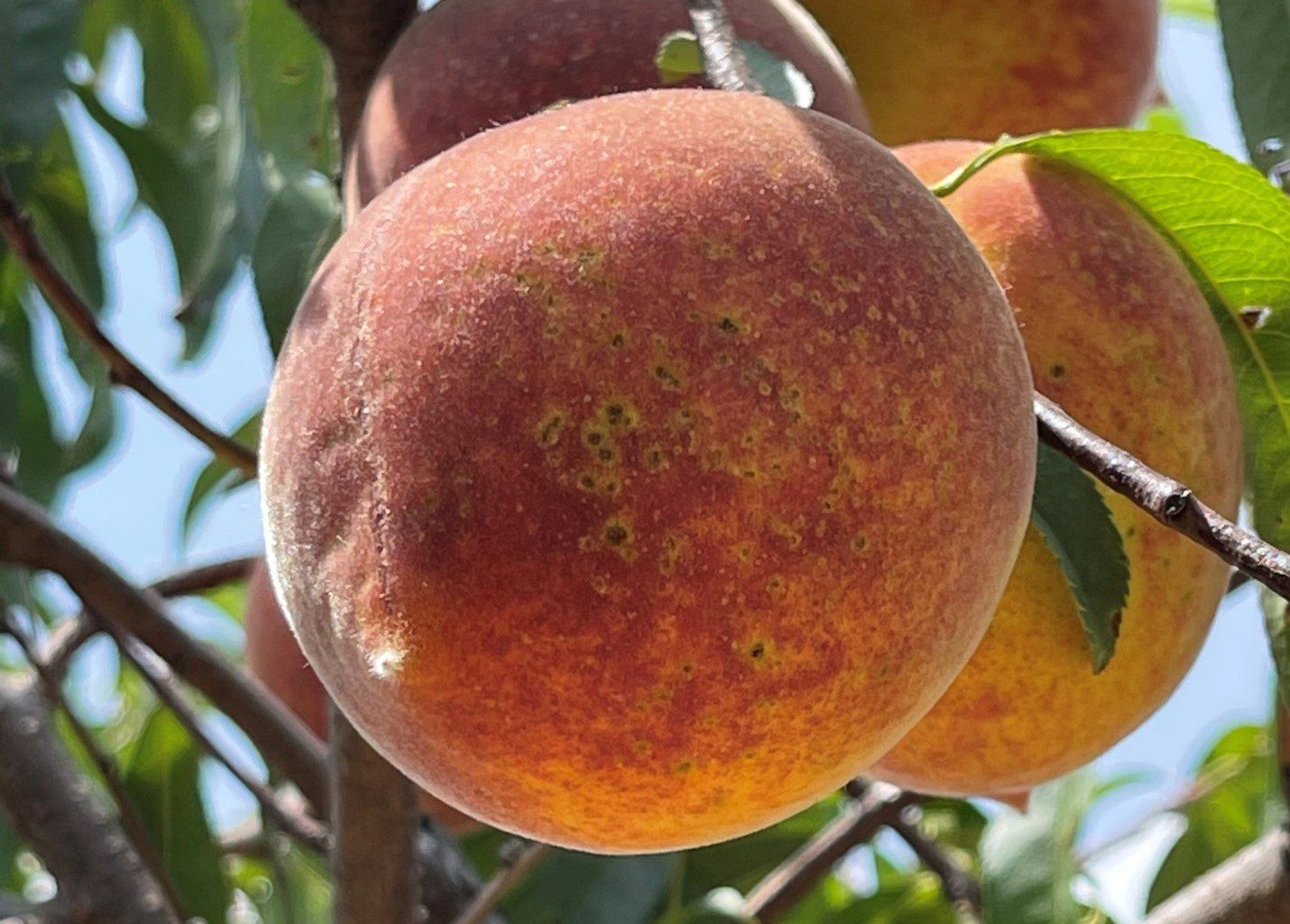 In more severe cases, the fruit may become infected. Small water-soaked spots can develop on the fruit at any time during fruit development. Early infection is the most concerning because the fruit is still increasing in size. When the bacterium infects leaves or fruit, it eventually destroys the tissue. Live tissue surrounding the dead tissue will continue to grow. The result is the development of unsightly cratering or pitting on the fruit (figure 4). Infection after fruit expansion results in superficial damage rather than pitting (figure 5). Bacterial spot produces similar symptoms to peach scab, which is caused by the fungus Cladosporium carpophilum. Peach scab produces spots on the surface of the fruit that are dark, round, and surrounded by a yellow halo (figure 6). Peach scab does not cause pitting or cracking like bacterial spot, and it does not infect leaves.