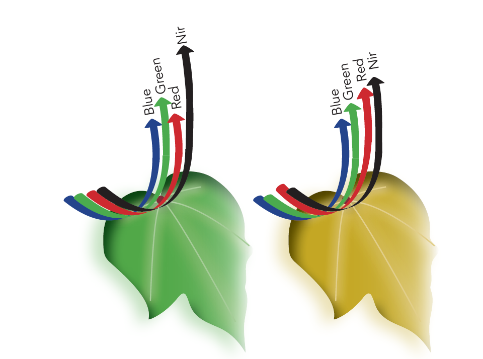 Therefore, light reflected by the leaves depends on the amount and various types of leaf pigments. For example, a green leaf with high chlorophyll content exhibits higher reflectance in the near-infrared (NIR) and green wavelengths than in the red wavelength (figure 3a). In contrast, a water-stressed leaf has low reflectance in the nonvisible wavelengths from about 750 to 1100 nm (figure 3b). Measuring the difference in reflected light at various wavelengths of the EM spectrum makes it possible to distinguish vegetation from soil, green and senescent vegetation, and vegetation species.