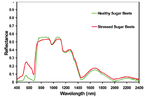 - Figure 3b. Change in spectral reflectance for a portion of the EM spectrum for a healthy sugar beet plant and one under water stress.
