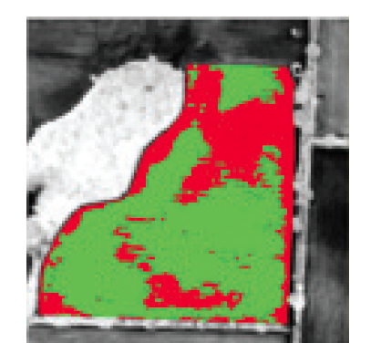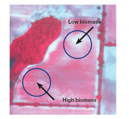 VIs have been widely used to assess vegetation condition, cover, and growth, as well as evaluate canopy attributes such as leaf area index (LAI) and plant height. Figure 5a shows a satellite image of a cotton field at peak biomass coverage. Colors on the image represent differences in growth; however, these differences are enhanced when the normalized difference vegetation index (NDVI) is calculated (figure 5b). This new image can then be used to classify areas with different biomass amounts that may correspond to yield differences (figure 5c). Different vegetation characteristics and canopy attributes can be characterized based on the band combination used for the VI calculation. Some of the most common VIs that correlate with chlorophyll content, biomass, LAI, and plant water stress are described in table 2.