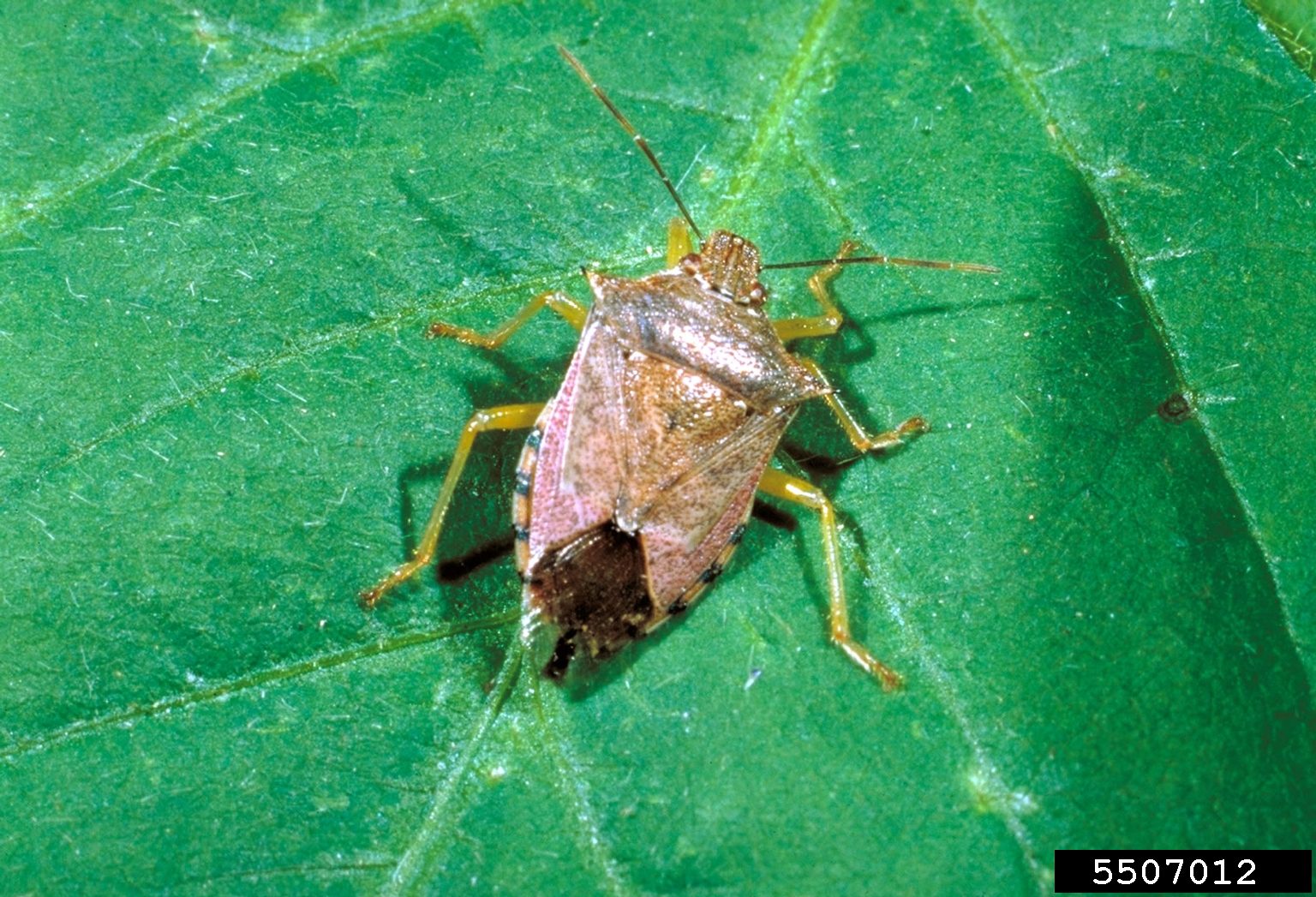 How to Identify: Often confused with brown stinkbugs, which they closely resemble, but spined soldier bugs have more pronounced shoulder spines. Their beaks are broad (roughly twice the width of their antenna) and stout. Plant-feeding brown stinkbug beaks are about the width of their antenna.