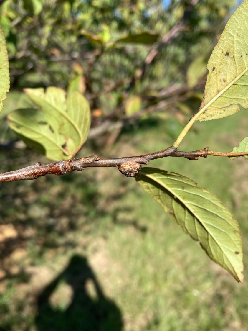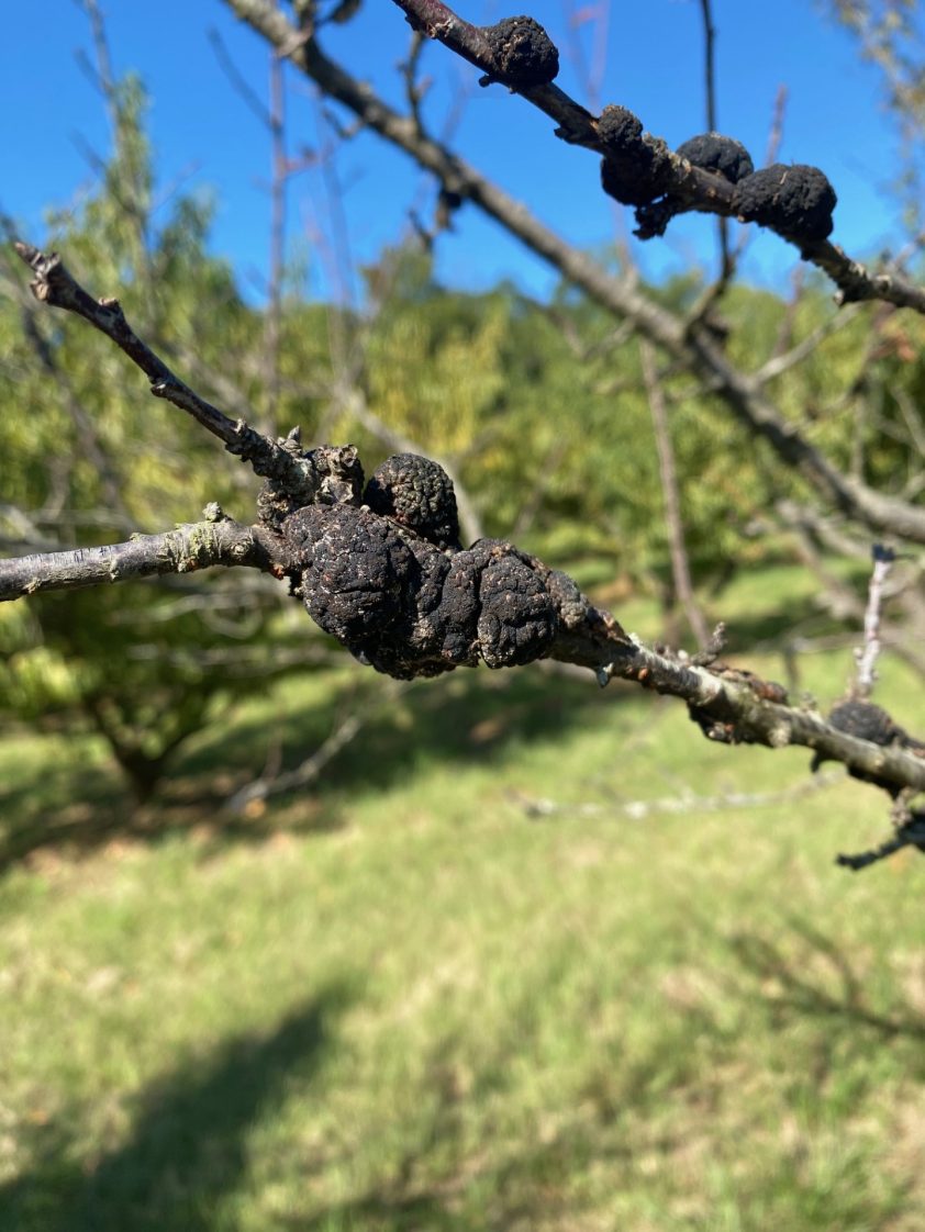 Black knot disease is a fungal infection caused by Apiosporina morbosa. This disease primarily affects plums, with the potential to infect other prunus species such as cherry and peach. Black knot disease is characterized by distinctive black, warty galls that form on branches and twigs, which can eventually girdle and kill the affected limbs. Galls can range in size from a half-inch to several inches long. Trees with severe infections often become stunted and misshapen, resulting in significant yield reduction.