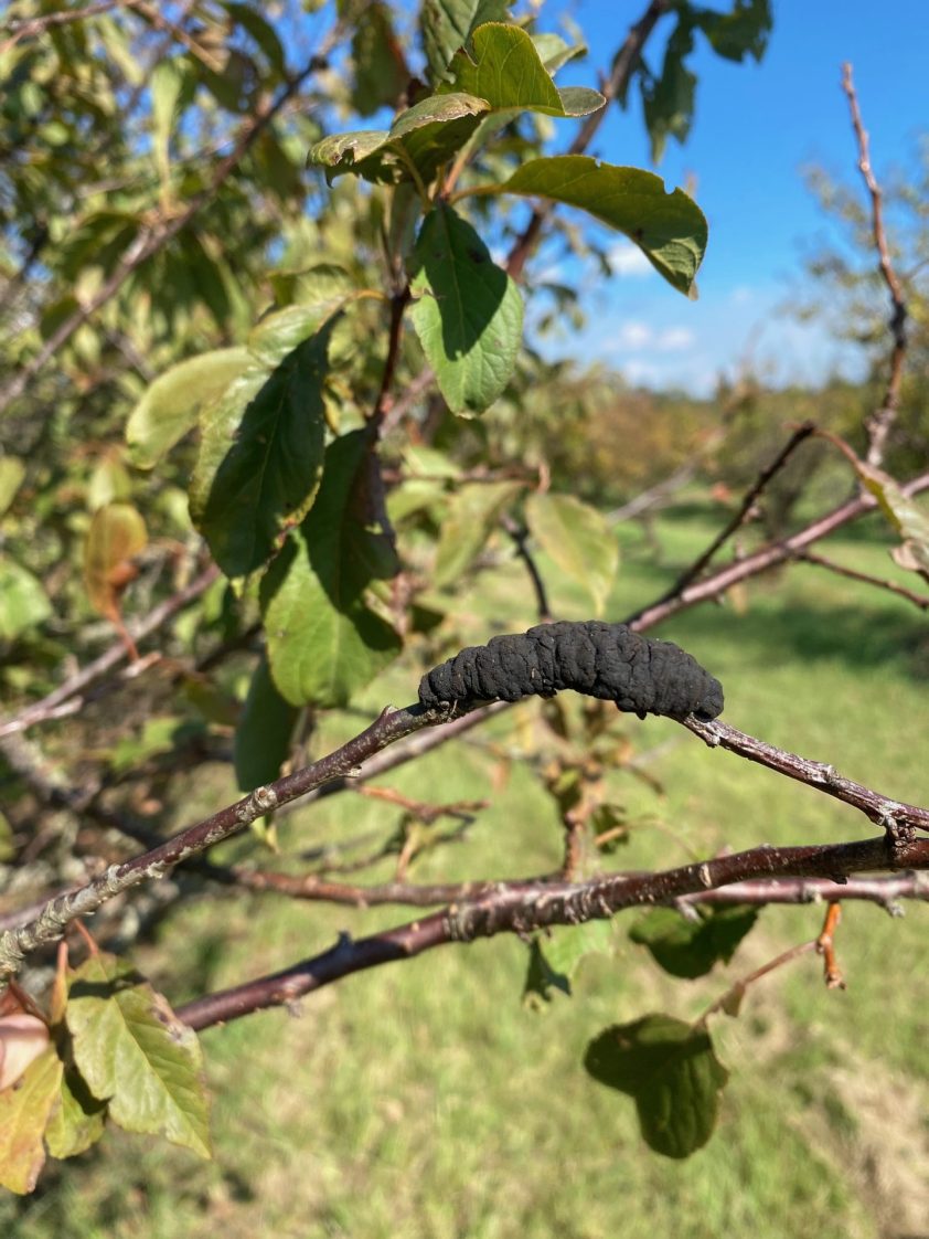 Regular inspection of trees is key to preventing the spread of black knot. While year-round inspection is important, the best time to identify these galls is during the winter when trees have dropped their leaves, making it easier to examine each branch. Prune out any galls, making sure to cut at least 6 to 8 inches below any visible infection. All infected plant material should be carried off site to reduce the inoculum in the field. Infected plant material can be burned or buried where allowed. Since black knot can also be found on native plums, removing any of these trees within 600 feet of desirable trees will help reduce the inoculum level and can help prevent infections.