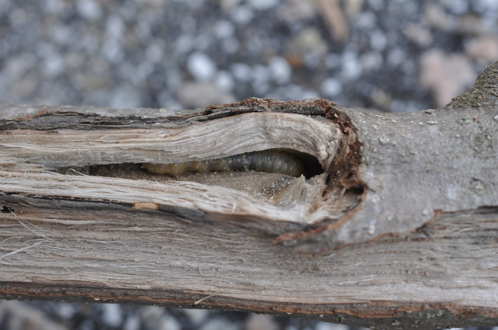 - Figure 17. Wood-boring caterpillars leave behind the pupal skin when they emerge. (Photo credit: Whitney Cranshaw, Colorado State University, Bugwood.org)
