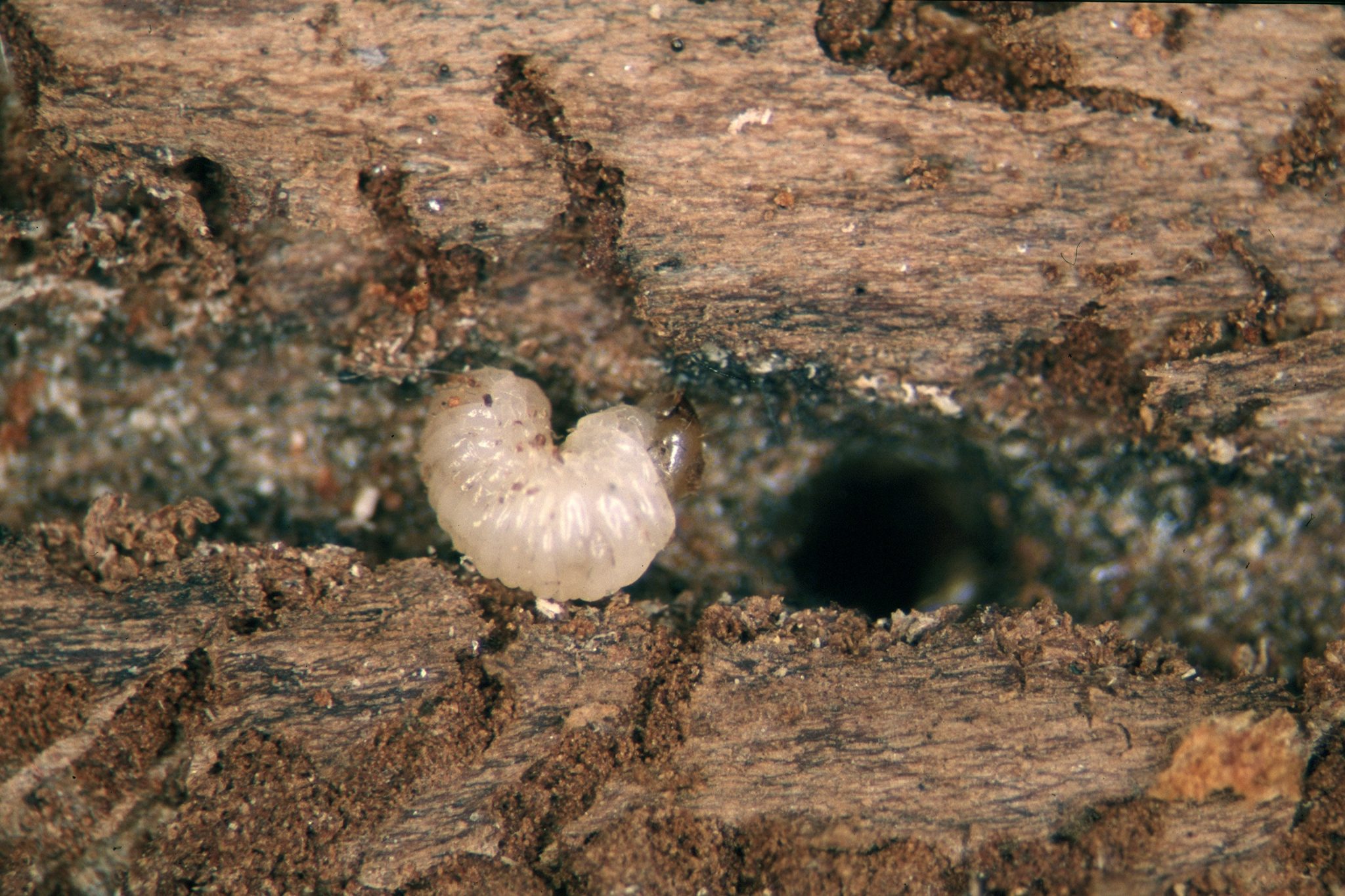 - Figure 12. Bark or ambrosia beetle larvae are always legless, but have a head that contrasts with their body. (Photo credit: Whitney Cranshaw, Colorado State University, Bugwood.org)
