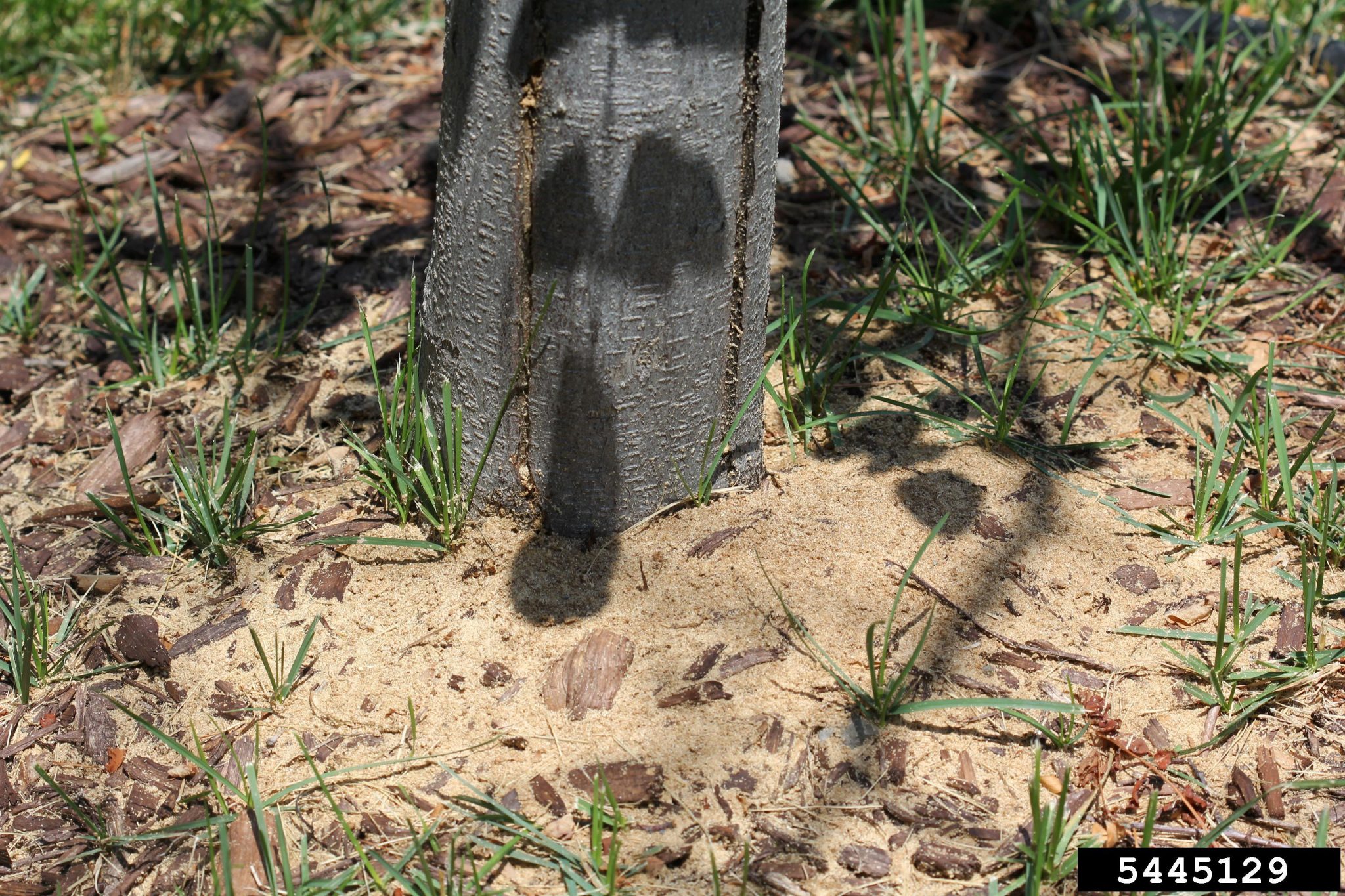 - Figure 14. Sawdust at the base of a tree or shrub can be an indication of a borer infestation. (Photo credit: Whitney Cranshaw, Colorado State University, Bugwood. org)