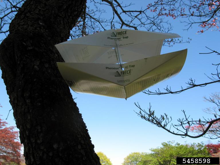 - Figure 23. A wing-type trap baited with pheromones is commonly used to monitor the flight of moths. (Photo credit: Dawn Dailey O’Brien, Cornell University, Bugwood.org)