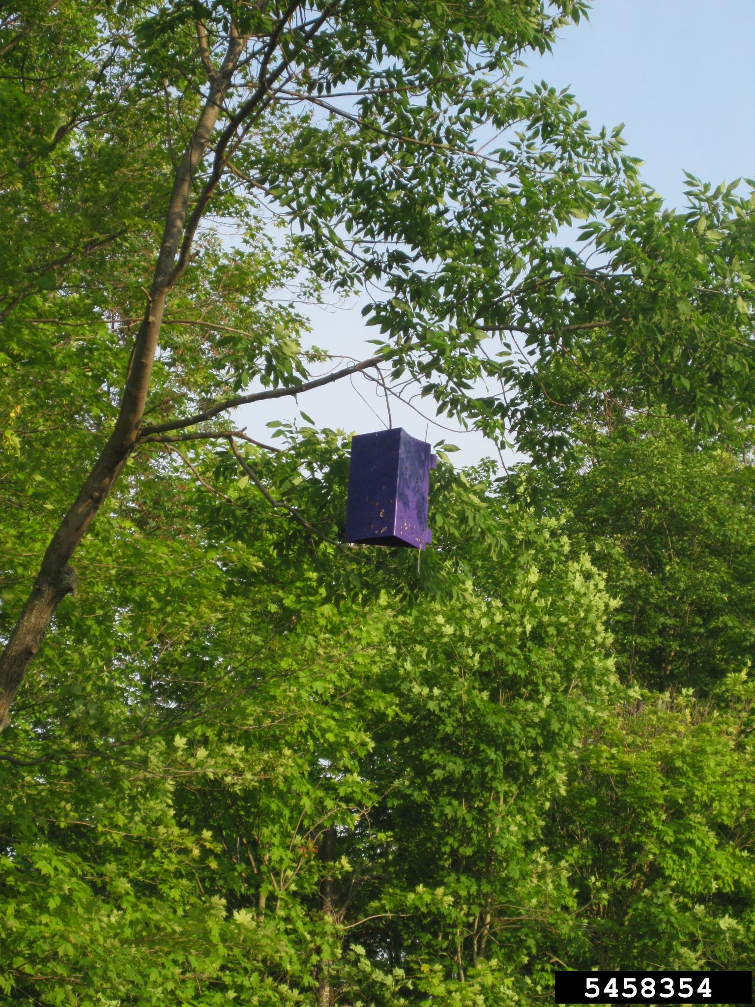 - Figure 24. A purple panel trap uses color to attract certain beetle borers. (Photo credit: Dawn Dailey O’Brien, Cornell University, Bugwood.org)