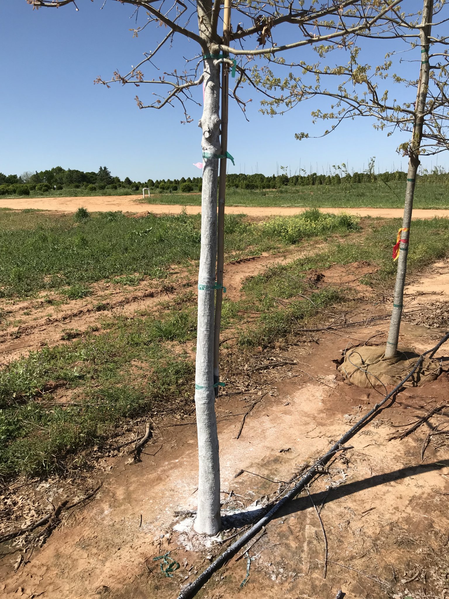- Figure 26. An oak tree just after a trunk spray of kaolin clay was applied. For comparison, note the tree on the right that was not treated.