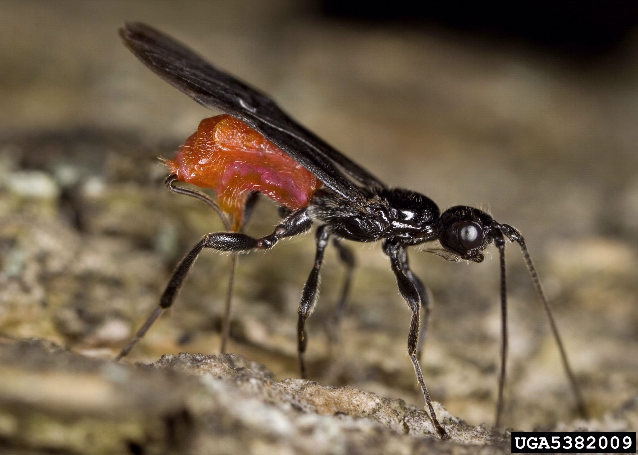 - Figure 27. Parasitoids that attack borers have a long ovipositor so they can sting the larvae in the gallery and deposit an egg. (Photo credit: David Cappaert, Bugwood.org)