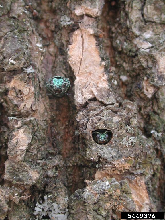 - Figure 9. Emerald ash borer adults emerging from D-shaped exit holes, characteristic of borers in the family Buprestidae. (Photo credit: Debbie Miller, USDA Forest Service, Bugwood.org)