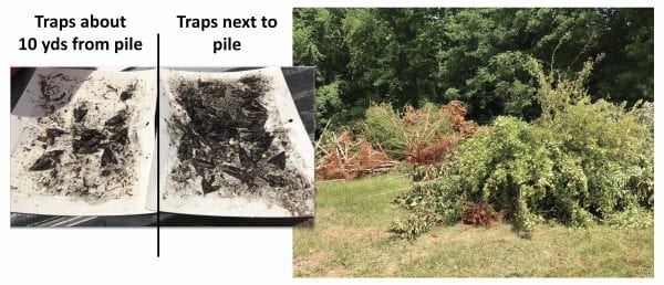 Figure 25. Trees infested with borers can be a source of new borers. The pheromone trap nearest to this pile at a nursery captured a large number of borers (carpenterworm moths).