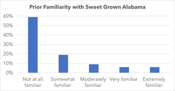 Participants were asked to rate their familiarity with Sweet Grown Alabama before taking part in the experiment. A majority of respondents (59 percent) indicated that they previously were not at all familiar with the Sweet Grown Alabama label, followed by 19 percent stating that they were somewhat familiar. There was a wide variation in familiarity across the different markets. For example, only 8 percent expressed some degree of familiarity at the Ross Bridge Farmers Market, whereas 67 percent had some degree of familiarity at the Madison County Farmers Market. During the experiment, all participants were given basic information about the program.