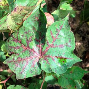 - Figure 9. Advanced symptoms of CLRDV-related virus disease in Alabama cotton include red to maroon discoloration of leaf petioles and terminal shoots with shortened internodes and sometimes a pronounced zig-zag growth pattern.