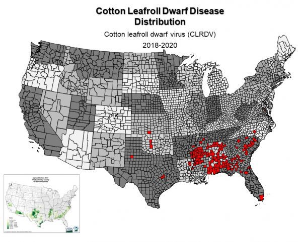 Cotton leafroll dwarf virus (US-CLRDV) (genus Polerovirus, family Luteoviridae) was first identified in the United States in samples collected from Barbour County, Alabama. Since then, the virus has spread across the cotton belt as far west as Texas and north to Virginia. Whole genome sequences were derived from symptomatic samples collected during 2018 from Barbour and Macon Counties, and their analysis showed that the strain of CLRDV found in the United States is different from the typical and atypical strains found in South America, identifying the CLRDV strain in Alabama as unique. Whole genome sequences of US-CLRDV isolates collected from other states have been completed and are similar across the cotton belt, suggesting a single introduction of the virus into the southeast United States. The disease caused by US-CLRDV has been named cotton leafroll dwarf disease (CLRDD).