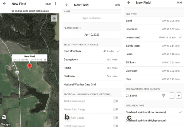 When creating a field (Figure 3a), the user is asked to select several parameters that will influence the ETc estimation and dictate the rainfall data’s main source, ultimately influencing the water balance calculations. As the field location is selected, the user has the option to select a nearby weather station from the University of Georgia, University of Florida, or Mississippi weather networks or use the national weather data grid as the main source of weather data needed for the ETc estimation and rainfall data input. The ETc estimation is less sensitive to changes for different options of weather station selection; however, rainfall is well known for large variability within a few miles radius. These SIAs allow the user to input rainfall data recorded at the field (Figure 3b), which can substantially improve the water balance calculations. If the user has a rain gauge from the manufacturers listed in Figure 3b, the rainfall data will be automatically uploaded to the SIA. Another option is to install a manual rain gauge and manually input rainfall data into the app daily. Alabama farmers interested in using this app can select the option of the national weather data grid as the source of weather information and manually input rainfall data collected in their fields. If the field is close to one of the Alabama Agricultural Experiment Stations, farmers can contact the authors of this publication to access the weather data collected by one of the automatic weather stations installed across the state.